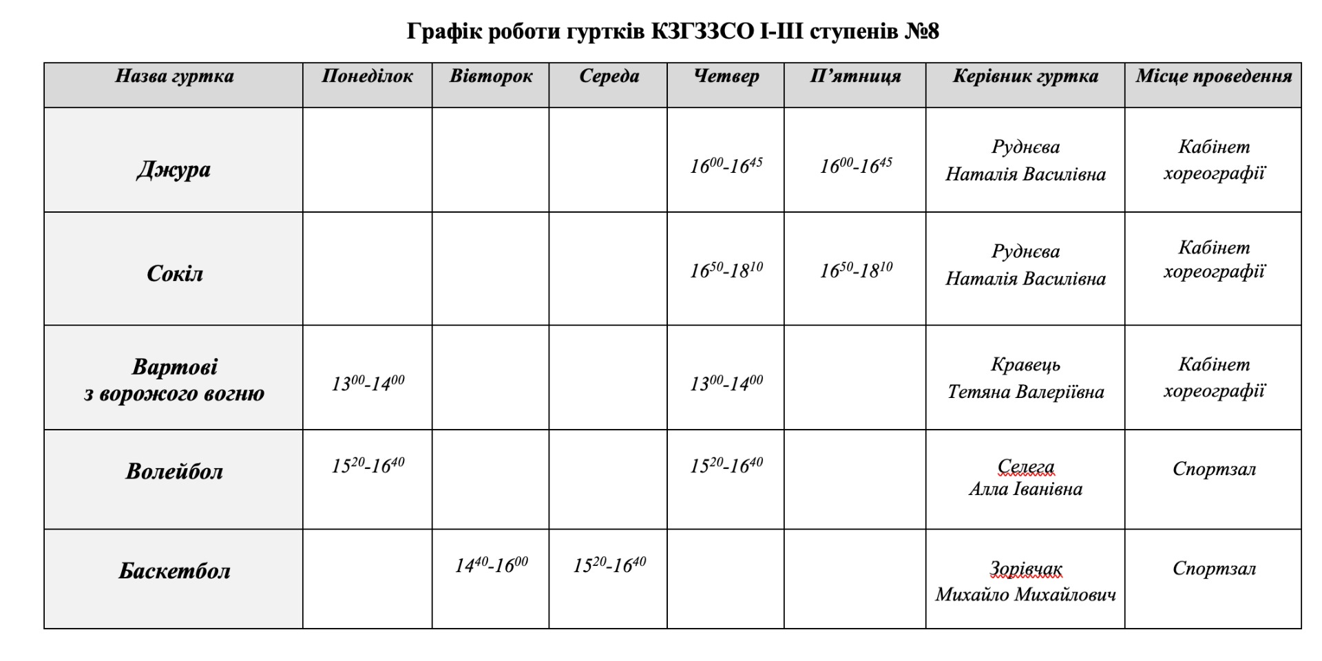 "Волейбол", керівник Селега Алла Іванівна - 4 год. (понеділок 15:30-16:50, вівторок 14:40-16:00, п'ятниця 14:40-16:00, спортивна зала)